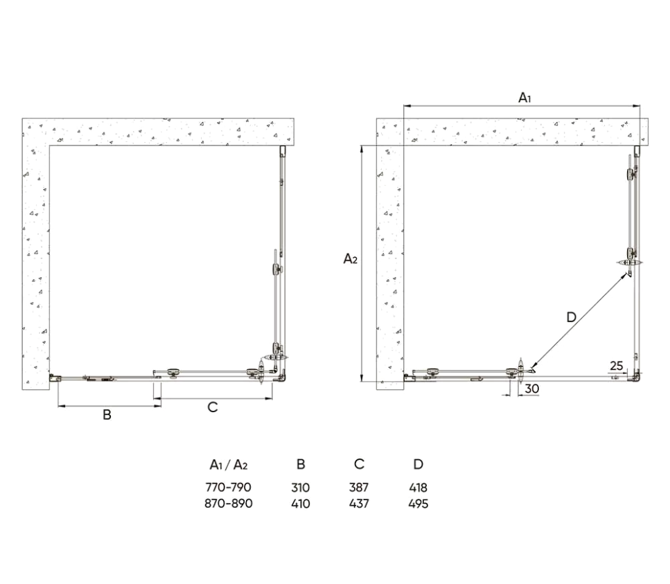 Квадратный раздвижной душевой уголок. Монтажный размер, мм: 870-890.