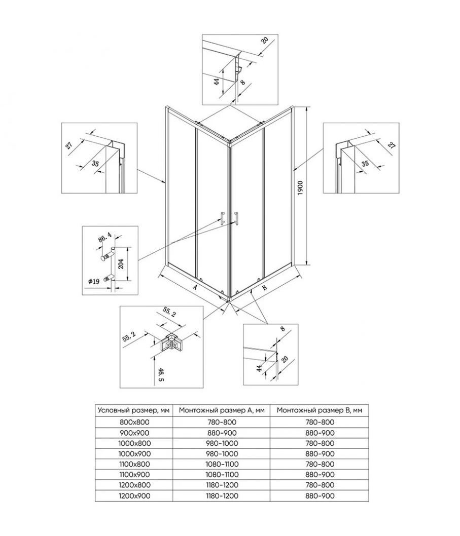 Душевой угол раздвижной. Две раздвижные двери. Стекло закалённое безопасное 5 мм. Магнитные уплотнители обеспечивают герметичное закрывание двери, плотно прилегая к профилю. Профиль анодированный алюминий. Цвет профиля - чёрный матовый. Регулируемые двойные ролики. Ручка из нержавеющей стали. Универсальная установка открывания двери. Позволяет устанавливать ограждение в зависимости от особенностей помещения. Поддон приобретается отдельно. Высота изделия 190 см.